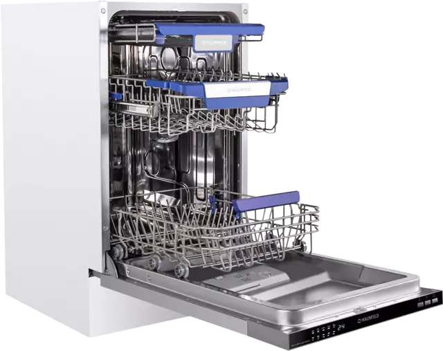 MAUNFELDMLP-083I Light Beam— это узкая модель, шириной 45 см (вместо классических 60 см), но весьма вместительная. За раз она может вымыть сразу много посуды, до 10 комплектов — это оценят в больших семьях, а также те, кто любит готовить, часто принимает гостей.